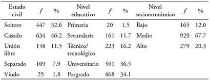 Se contó con la participación de 1373 personas colombianas, 377 (27.5%) hombres y 996 (72.5%) mujeres con edades comprendidas entre los 18 y los 84 años (M=40.57; D.T.=12.65). Se contactaron por medio de un muestreo no probabilístico por sujetos disponibles. Como criterios de inclusión se consideraron la aprobación del consentimiento informado, ser mayor de edad, tener hijos y estar enfrentando o haber enfrentado una situación familiar crítica recientemente (divorcio, enfermedad de un pariente cercano, muerte de un familiar cercano, crisis económica, indagado en el formulario de respuesta). Una mayor información de los participantes se muestra la Tabla 1.