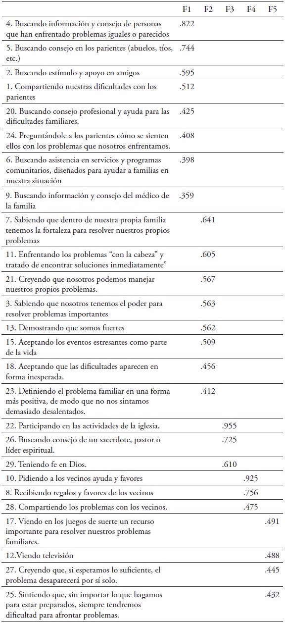 Los hallazgos permiten indicar que la escala F-COPES muestra una estructura en cinco factores, igual que en estudios previos, con una explicación del 39.7% de la varianza total acumulada. Esta estructura al someterse a análisis de modelos rivales, por medio de análisis factoriales confirmatorios, muestra mejores indicadores de ajuste que la organización original (cinco factores también, pero con distribución diferente de los ítems). Los cuatro primeros factores conservaron la misma denominación obtención de apoyo social, reestructuración cognitiva, búsqueda de apoyo espiritual, y evaluación pasiva, y el nuevo factor, por el patrón de los ítems se denominaría apoyo en vecinos.