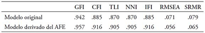Tabla 3 Indicadores de bondad de ajuste para el modelo original y el modelo obtenido tras el AFE
