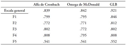 Como se observa en la Tabla 4, los hallazgos reportan altos índices de fiabilidad (> .70, hasta .921) para la escala total y para los cuatro primeros factores, aunque el factor 5 reporta bajos indicadores. Debe señalarse que, en todos los ítems y en todos los factores, los valores se afectan ante la eliminación hipotética de cualquier reactivo, que hay correlaciones positivas y superiores a .3 en todos los ítems y el total, así como, entre todos los ítems en cada subescala.