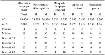 Como se observa en la tabla anterior, la distribución conserva la estructura penta-factorial, sin embargo, se halló que el factor 4 reúne ítems relacionados al acompañamiento con vecinos. Se conservaron los nombres originales de los factores así: F1=obtención de apoyo social; F2=reestructuración cognitiva; F3=búsqueda de apoyo espiritual; F4=apoyo en vecinos (nuevo factor); F5= evaluación pasiva. Los ítems del factor original de movilización familiar se reparten en el nuevo factor de apoyo en vecinos y el factor de obtención de apoyo social.