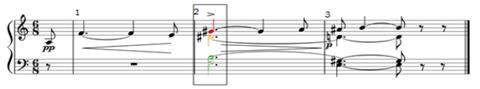 La suspensión puede verse en la Ilustración 2, en el paso del Acorde de Tristán (ubicado en el segundo compás y señalado por un rectángulo) al siguiente acorde. Todas las notas cambian, excepto la segunda voz (marcada con amarillo), generando una tensión que no permite la resolución “total” del discurso musical. Schopenhauer también dice que: “La cadencia perfecta requiere la precedencia del acorde de séptima sobre la dominante, pues la satisfacción sentida en lo más profundo, y el completo reposo, solo pueden seguir al deseo más apremiante. Así pues, la música consiste en un cambio60 constante de acordes más o menos inquietantes, es decir, estimulantes deseos, y acordes más o menos tranquilizadores y placenteros. De igual manera, la vida del corazón (la voluntad) es un continuo intercambio entre la mayor o menor inquietud que nos causan el deseo o el miedo, con una dosis igualmente distinta de satisfacción. Y el desarrollo armónico consiste en la alternancia de la disonancia y la consonancia conforme a las reglas del arte musical”61.