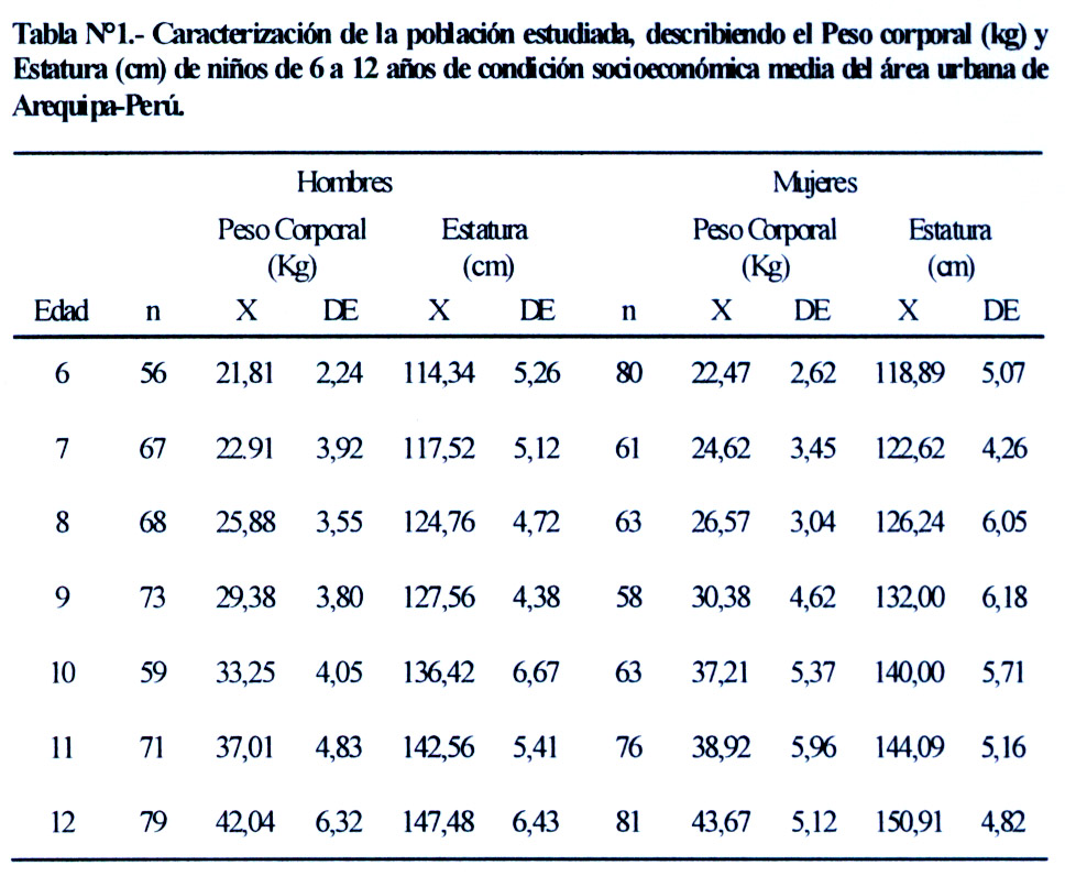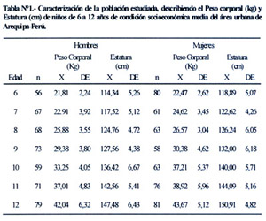 La tabla N°1 muestra los valores medios y la desviación estándar de las medidas antropométricas clásicas de la masa corporal (kg) y estatura (cm) de niños de ambos sexos. Se observa una clara tendencia de aumento de ambas variables desde los 6 hasta los 12 años, respectivamente.