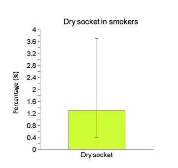 The sample included 237 patients who were smokers (19.6%; CI95: 17.5% to 21.9%). Amongst the smokers, 3 suffered dry socket (1.3%; CI95: 0.4% to 3.7%; Figure 1). Within the 972 non-smokers, 9 experienced dry socket (0.9%; CI95: 0.5% to 1.8%). No significant relationship was found between smoking and presence of dry socket (Chi-square=0.22; df=1; p=0.64).