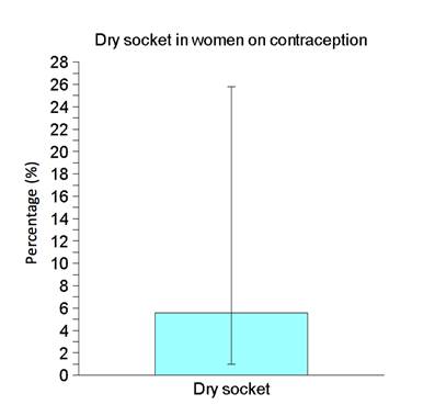 Eighteen patients took oral contraceptives, equivalent to 1.5% of the total of patients treated (CI95: 0.9% to 2.3%), or 6.7% of total of females (CI95: 4.3% to 10.3%). Only one of the 18 women who took oral contraceptives suffered dry socket (5.6%; CI95: 1.0% to 25.8%, Figure 2); and 3 of the 251 women who did not take oral contraceptives did suffer dry socket (1.2%; CI95: 0.4% to 3.5%). This study found no significant association between the use of oral contraceptives and the occurrence of dry socket (Chi-square=2.18; df=1; p=0.14).