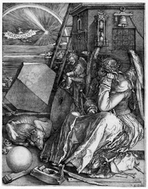 Esta confrontación entre la melancolía como una dolencia corporal y a su vez como una fuerza creadora es la base de la creación del grabado «Melancolía I», donde los personajes del mismo plantearían este dilema intelectual, especialmente en su figura principal que hace referencia a una condición anímica atormentada pero a la vez inspiradora. Allí el ángel con su gesto compungido -pero a la vez reflexivo-, expresa los dilemas que tiene el autor sobre su capacidad creadora, la forma en que su condición de artista-artesano es catalogada por su sociedad como algo poco benigno y la manera en la cual su talento es el camino para alcanzar la divinidad como individuo, pero siempre bajo una instancia espiritual y mística. Por ende: