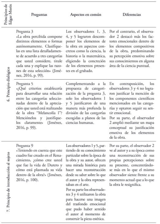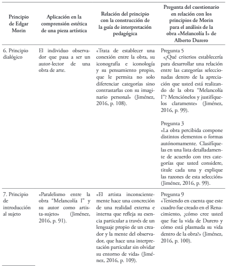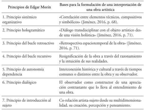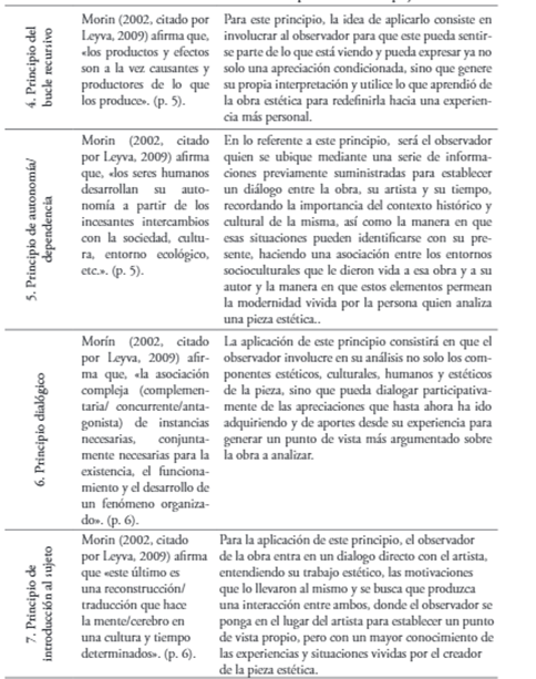Por consiguiente, en la Tabla 1 se podrá apreciar la integración entre los principios del paradigma de la complejidad de Morin (2001) y su aplicabilidad al análisis y apreciación de una obra estética con el fin de llegar a la elaboración de una guía de interpretación pedagógica que dé cuenta de la aplicación de un análisis cualitativo hermenéutico y que tenga como base una lectura interpretativa de una obra de arte.