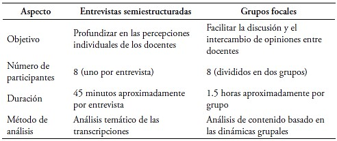 Como se tiene dicho, dentro del estudio realizado en la Universidad Nacional de Piura, se optó por emplear dos técnicas cualitativas principales para recopilar datos sobre las percepciones de los docentes hacia la IA: las entrevistas semiestructuradas y los grupos focales. Estas técnicas, aunque complementarias, ofrecen perspectivas distintas y permiten abordar el objeto de estudio desde diferentes ángulos. A continuación, se presenta un cuadro comparativo que detalla los aspectos clave de cada técnica, desde su objetivo y número de participantes. Este desglose permite apreciar la profundidad y amplitud del enfoque metodológico adoptado en la investigación.