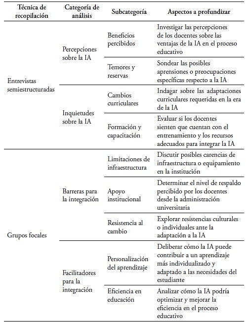 Después de presentar los pormenores de las técnicas, es preciso destacar que cada una de ellas, con su enfoque particular, abordó categorías y subcategorías específicas que arrojaron luz sobre diversos aspectos de la relación entre los docentes y la IA. A continuación, se desglosan las categorías y subcategorías de análisis asociadas a cada técnica, proporcionando un marco metodológico detallado para la investigación.