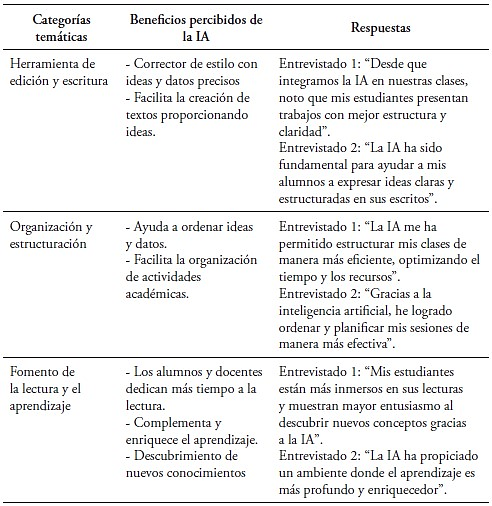 A partir de las entrevistas realizadas, se identificaron distintas categorías temáticas que reflejan los beneficios percibidos de la IA en el ámbito educativo. Estas categorías, que abarcan desde la edición y escritura hasta el fomento de la lectura y el aprendizaje, evidencian cómo docentes y estudiantes han integrado y aprovechado las herramientas de IA en sus procesos académicos.