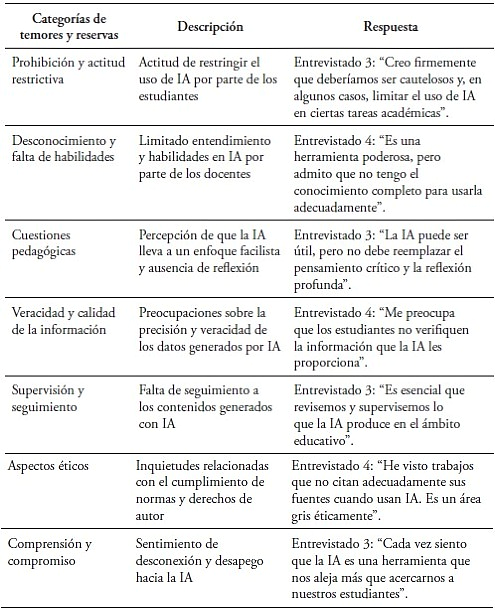 Sin embargo, a pesar de las ventajas percibidas, emergieron inquietudes significativas. La reticencia de algunos docentes, como el entrevistado 3, hacia un uso indiscriminado de la IA y las preocupaciones del entrevistado 4 sobre la veracidad de la información proporcionada por estas herramientas resaltaron la necesidad de un abordaje crítico. Estas percepciones individuales se alinearon con investigaciones previas, como las de Reinoso (2022) y Gómez (2022), que subrayan la importancia de una adaptación consciente y reflexiva a esta tecnología.