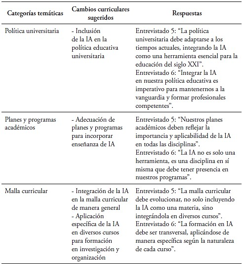 Las respuestas de los entrevistados 5 y 6 subrayan la necesidad imperativa de integrar la IA en el ámbito académico. Ambos docentes coinciden en que la política universitaria, los planes académicos y la malla curricular deben evolucionar para reflejar la creciente relevancia de la IA en la educación contemporánea y garantizar una formación integral y actualizada.