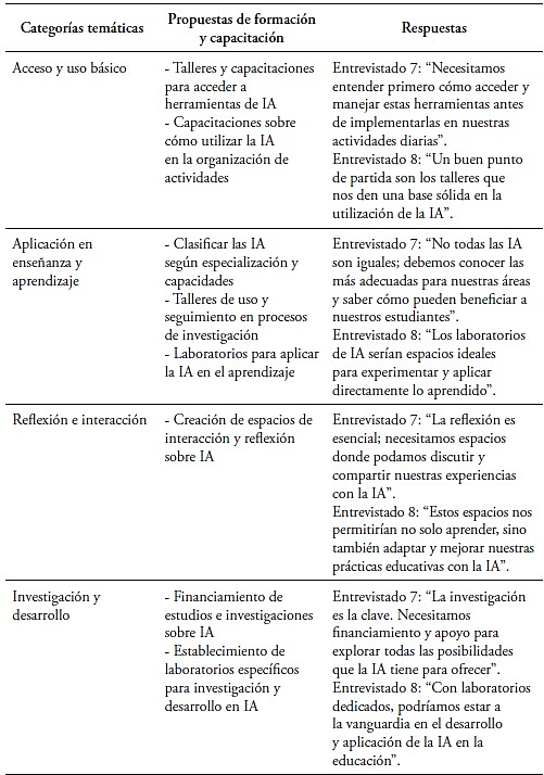Sin embargo, la integración completa de la IA presenta desafíos. La capacitación emerge como un aspecto primordial. El entrevistado 7 subraya la necesidad de distinguir entre las distintas herramientas de IA y su adecuada aplicación. El entrevistado 8 coincide, al destacar la relevancia de espacios donde se puedan discutir y experimentar con estas tecnologías. Dichos espacios no solo promoverían un entendimiento profundo de la IA, sino que también incentivarían una adaptación pedagógica informada.