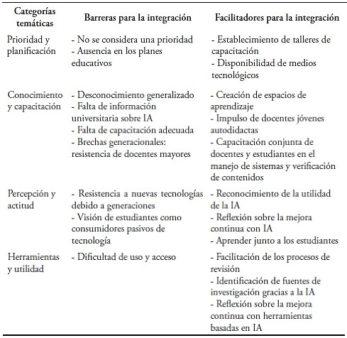Finalmente, los hallazgos se visualizaron mediante tablas para ofrecer una representación clara de las relaciones entre los temas identificados. Esta visualización complementó el análisis y facilitó la interpretación y discusión de los resultados. En resumen, se observó que la codificación y análisis de datos cualitativos en este estudio fue un proceso iterativo y reflexivo que, llevado a cabo con rigor, proporcionó perspectivas valiosas sobre la percepción e inquietudes de los docentes, así como las barreras para la integración y los facilitadores para la integración de la IA a la institución universitaria.