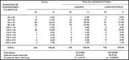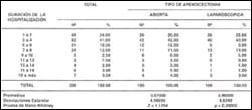 Objetivo. evaluación comparativa de la apendicectomía abierta versus apendicectomia laparoscópica, se evalúa: a) Características como, edad, sexo, ocupación, tiempo de enfermedad, signos y síntomas, pruebas de laboratorio y diagnóstico pre y post operatorio, terapia con antibióticos antes y después de la cirugía, tiempo de anestesia. b) Técnica operatoria respecto a: tiempo pre operatorio, accidentes operatorios, estadía hospitalaria y complicaciones. c) Evaluación comparativa de los costos y beneficios de ambas técnicas.