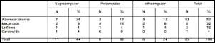 En cuanto a los hallazgos endoscópicos, predominó la lesión mixta (40%), seguida por la lesión ulcerada (36%), proliferativa (16%) e infiltrativa (8%); dentro de las lesiones tipo mixta, la proliferativa-ulcerada e infiltrativa ulcerada fueron las más frecuentes con 5 (50%) y 4 casos (40%) respectivamente, y se halló un sólo caso de lesión proliferativa infiltrativa (10%). La lesión mixta predominó en los casos de adenocarcinoma y la ulcerada en las lesiones metastásicas y linfomas (tabla 5). La localización supraampular fue la más frecuente (44%), seguida por la periampular (32%) e infraampular (24%). En los casos de adenocarcinoma predominó la localización supraampular y en las lesiones metastásicas la periampular (tabla 6).