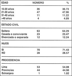 Es importante establecer algunas características demográficas para hacer una interpretación adecuada de la población en estudio. Aproximadamente el 85% de las trabajadoras sexuales tienen un promedio de edad menor a los 30 años, la mayoría son solteras, y solo un 23.47% son casadas o convivientes.