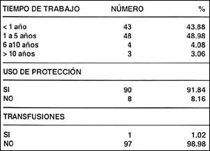 Como se ve en la Tabla 2, el tiempo de trabajo fue menor a cinco años en mas del 90% de las trabajadoras sexuales; un porcentaje similar refiere usar protección con preservativos y solo una paciente tenia antecedente de haber recibido una transfusión sanguínea.