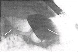 The drainage was achivied by transpapillary endoscopic retrograde pancreatic drainage (ERPD) (Fig.2), endoscopic cystogastrostomy (ECG) (Fig.3) or endoscopic cystoduodenostomy (ECD). ERPD and ECG are combined in cases of multiple cysts if one cyst cannot be drained due to lack of comunication with the pancreatic duct (Fig.4). Generally the pseudocyst can be endoscopically localised as a prominent impression of the gastric wall. If the endoscopic identification of the cyst is difficult the transmural drainage should be performed under endosonographic control.