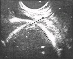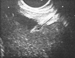 The endoscopic identification of pancreatic pseudocysts may be difficult if there is no protrusion of the gastric or duodenal wall. In these cases EUS-guided drainage of pseudocyst is precise and can be performed even if the cyst dose not produce an endoscopic appear bulge(5,6) (Fig. 6). The advantages of this diagnostic procedure are: 1) exact localization of the pseudocyst. 2) identification of retrogastral blood vessels (Fig.7). 3) differential diagnosis between malignant and benign cystic lesions and intracystic haemorrhage. 4) precise punction with the cystotom under EUS-control (Fig.8). 5) contrary to ERP, riskless use of EUS in case for acute pancreatitis. 6) measurement of the thickness of the cystic wall.