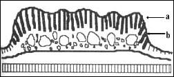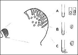 Fig. 1.- Esquema de un pólipo que muestra 3 fases de reacción celular: El tubo A, revestido de células normales y regeneradas; B, tubo revestido de células indiferenciables de las células malignas (atípia celular), que cuando penetran en los tejidos (rompen la membrana basal), se denomina carcinoma; este estado fue denominado "citoplasia secundaria" (displasia) por el autor. C, inva-sión de los tejidos que rodea los tubo (lamina propia) por células consideradas decididamente carcinomatosas.