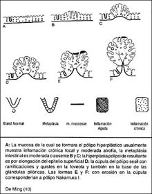 Especial consideración reviste para nosotros la clasificación de Nakamura, no sabemos exactamente la razón por la que pone primero al tipo II es decir al pólipo con erosión y en segundo lugar al pólipo tipo I que es un pólipo sin erosión. La razón estriva, seguramente en el hecho de que el tipo II corresponde a erosión crónica regenerada; lo que también da lugar a interpretar que las hiperplasias suprafoveales serían la etapa inicial de los pólipos hiperplásticos. Este tipo de formación polipoide en general es de pequeño diámetro, histológicamente la lesión consiste en una formación polipoide con erosión central con una base necrotica conteniendo restos inflamatorios, limitadas por criptas hiperplásticas alargadas y tortuosas tapizadas por células relativamente indiferenciadas. Los cambios inflamatorios en la lamina propia varían en severidad. La erosión es superficial y las muscularis esta intacta, se pueden observar dilataciones quísticas. La persistencia de estas lesiones aún cuando la erosión cure daría lugar a la formación del pólipo Nakamura II. Como mencionaremos después este tipo de pólipo podría estar en relación con la infección por helicobacter pilory.