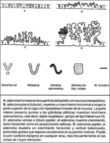 Raramente los adenomas vellosos aparecen compuestos de células epiteliales gástricas y Hirota en 144 adenomas solo 6 (4.2%) fueron de tipo gástrico y 3 (2.1%) mixtos y el resto de tipo intestinal.