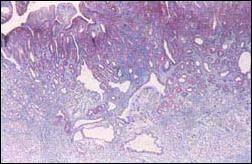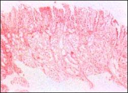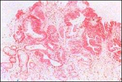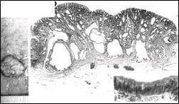 Las microfotografías 15 y 16, de nuestra casuística, muestran pólipos catalogados como Nakamura III. Presentan una apariencia sesil. histologicamente peculiar con estructura en 2 capas; la capa superior consiste en glándulas displásicas, simulando glándulas de Lieberkuhn, mientras la capa inferior presenta glándulas pilóricas no displásicas y numerosos quistes.