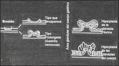 Desde hace mucho tiempo el profesor Sano daba una interpretación de la histogenesis de las llamadas "lesiones elevadas" (pólipos) a punto de partida de una erosión. En el esquema número 1 señaló que una erosión puede evolucionar en 2 sentidos: o desaparece o al prolongarse su existencia da lugar a formas polipoideas de tipo inflamatorio que presentan una depresión central, lesión a la que se llamo "en ventosa de pulpo". Cuando estas formaciones comprometen el área glandular pueden resultar en una hiperplasia de las glándulas pilóricas o de las glándulas de cuerpo, generando un verdadero pólipo al que se le pude denominar a diversas maneras: hiperplasias suprafoveales, "pólipos inflamatorios", pólipos regenerativos y finalmente pólipos hiperplásticos.