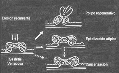 En el esquema número 2 el profesor Sano consideraba que una erosión permanente o recurrente, por ejemplo formación "en ventosa de pulpo" o "varioliforme" daría lugar en la gran mayoría de casos a un pólipo regenerativo o con menos frecuencia a una epitelización atípica vale decir inicialmente fenómenos de alteración epitelial que para nosotros podría representar fenómenos de tipo displásico (adenoma) con alteración de la estructura y atipia celular. Este segundo paso, no es mencionado por el autor. Finalmente habría una hiperplasia "atípica" de las glándulas del cuerpo como paso previo al proceso de cancerización.