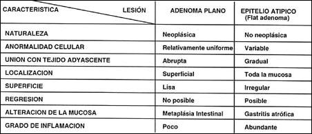 Debe precisarse que el llamado "epitelio atípico" y el adenoma plano tienen características diferentes, que no deben ser confundidas. En la tabla ( 3 ) señalamos estas características :