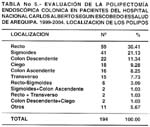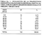 Evaluación de la Polipectomía Endoscópica Colónica en pacientes del Hospital Nacional Carlos Alberto Seguín Escobedo Essalud de Arequipa 1999-2004 Yanyne Suárez Cueva 1; Juan Campos Nizama2 1 Médico Gastroenterólogo. RESUMEN El presente trabajo se realizó en el Hospital Nacional Carlos Alberto Seguín Escobedo-EsSalud-Arequipa en los 194 pacientes que fueron sometidos a Polipectomía Endoscopía Colónica en el periodo comprendido entre Enero de 1999 a Diciembre del 2004. PALABRAS CLAVES: Colonoscopia, polipectomia endoscópica, pólipos del colon. SUMMARY The investigation was performed in the Carlos Alberto Seguín Escobedo National Hospital of Essalud-Arequipa, in 194 patients that were submitted to Colonic Endoscopic Polipectomy from January of 1999 to December of 2004. KEY WORDS: Colonoscopy, endoscopic polipectomy, colonic polyps. INTRODUCCIÓN En el campo de la gastroenterología se ven cada día nuevas técnicas y modalidades de diagnóstico y de tratamiento. Todas estas nuevas modalidades son importantes porque tienen que ver con el diagnóstico de lesiones tempranas o en estadios con potencial curativo, pudiendo ser utilizadas como forma de tamizaje en poblaciones de alto riesgo, para mejorar el diagnóstico y en consecuencia ofrecer mejores resultados en la parte terapéutica.1,2,3,4 La endoscopia digestiva ha hecho posible explorar en forma cada vez más acuciosa los diferentes segmentos del aparato digestivo gracias al continuo perfeccionamiento tecnológico, que hace posible que contemos con equipos flexibles de imagen nítida, livianos y fácilmente maniobrables.2,3,5 A los adelantos propios del área de gastroenterología en diagnóstico se han agregado los de cirugía endoscópica que permite variados procedimientos terapéuticos en cuadros clínicos que en épocas pasadas habían sido de tratamiento quirúrgico convencional, podemos mencionar entre ellos la polipectomía endoscópica, dilataciones esofágicas, manejo de ectasias vasculares y de hemorroides complicadas.1,5,4,6,7 La polipectomía endoscópica colónica (PEC) ha sido la revolución en el tratamiento de la neoplasia colónica benigna, es sin duda el procedimiento más frecuentemente utilizado desde su introducción en el manejo de los pólipos de colon. El propósito de la polipectomía es remover toda la lesión o las lesiones y así dejar la cirugía convencional sólo para los pólipos en que una simple polipectomía no es suficiente o impracticable, constituyéndose en un procedimiento de rutina, seguro, rápido y eficaz.2,3,4,5,7,8,9 Los pólipos colónicos es un tópico que ha tomado gran importancia a nivel mundial, sobretodo en países desarrollados, los cuales presentan niveles elevados de morbimortalidad por cáncer de colon, ya que se sabe que estos constituyen lesiones preneoplásicas que se asocian a factores genéticos y ambientales. Los pólipos colónicos son lesiones que se proyectan por encima de la superficie de la mucosa de colon. El creciente interés por los pólipos es consecuencia del avance en la capacidad de detectarlos con alto grado de sensibilidad y extirparlos por vía endoscópica, está demostrado que la mayor parte de las neoplasias de colon hasta en un 97%, se originan en un pólipo de tipo adenomatoso previamente benigno. La extirpación total del pólipo permite al patólogo tener una visión completa de la lesión, el grado y ubicación de las atipias que pudieran existir y de la presencia de degeneración. 1,2,3,4,6,7,8,10,11,12 En la actualidad existe ya suficiente evidencia para afirmar que la (PEC) disminuye la incidencia de cáncer colorectal, la remoción de pólipos disminuye la probabilidad de desarrollar cáncer en 70 a 90%.1,2,3,4,7,10,13,14,15,16 Conocedores de las tendencias enunciadas anteriormente en el uso de la (PEC), en el diagnóstico y tratamiento de los pólipos colorectales y ante la ausencia de un estudio sobre este tema en nuestro medio y para aportar información que permita establecer las bases de investigaciones futuras, protocolos de manejo para la evaluación y tratamiento de dichos pacientes es que nos motivamos a la realización de este trabajo que consiste en evaluar los resultados de la (PEC) en pacientes del Hospital Nacional Carlos Alberto Seguín Escobedo Essalud de Arequipa de 1999 al 2004. OBJETIVOS OBJETIVO GENERAL Evaluar los resultados de la (PEC) en Pacientes del Hospital Nacional Carlos Alberto Seguín Escobedo Essalud de Arequipa de 1999 al 2004. OBJETIVOS ESPECíFICOS Determinar las características propias de los pacientes a quienes se le realizó (PEC) en el presente estudio. Determinar las características endoscópicas de los pólipos colónicos de los pacientes en estudio. Conocer los tipos histológicos y grado de displasia de los pólipos colónicos obtenidos por (PEC). Conocer la patología colónica asociada a pólipos en colon en pacientes a quienes se le realizó (PEC). Determinar la técnica empleada de la (PEC) y las complicaciones presentadas. Conocer si hubo tratamiento complementario en los pacientes luego de la (PEC). MATERIAL DE ESTUDIO AMBITO DE ESTUDIO El ámbito de estudio es el servicio de Gastroenterología del Hospital Nacional Carlos Alberto Seguín Escobedo Essalud de la ciudad de Arequipa, en todos los pacientes a quienes se les realizó (PEC) durante los años 1999 y 2004. Se determinó la población de estudio teniendo en cuenta lo siguiente: CRITERIOS DE INCLUSIÓN Pacientes de cualquier edad y sexo, a quienes en el servicio de Gastroenterología se les realizó (PEC) en las fechas de Enero de 1999 a Diciembre del 2004. Pacientes que cuenten con Historia Clínica, Informe Endoscópico del Servicio de Gastroenterología e Informe del Servicio de Anatomía Patológica. CRITERIOS DE EXCLUSIóN Pacientes que no cumplan con los criterios de inclusión. UNIVERSO Y/O MUESTRA Nuestra población de estudio está constituida por el total de pacientes a quienes en el Servicio de Gastroenterología se