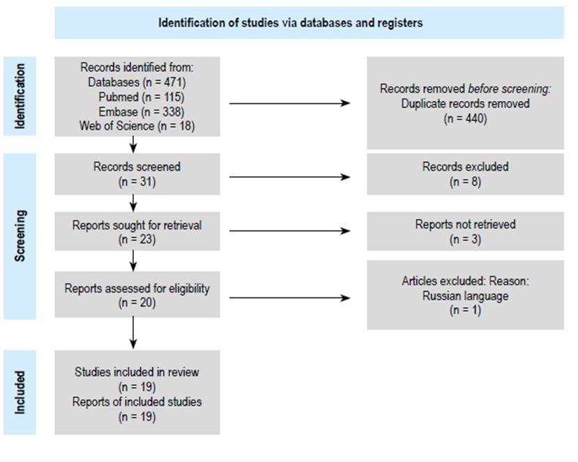 La búsqueda en las bases de datos arrojó 338 referencias en EMBASE, 115 en PUBMED, 9 en CENTRAL, y 9 en literatura gris; posteriormente, 440 fueron excluidos luego de revisar el título y el resumen. De las 31 referencias seleccionadas para revisión en texto completo, 13 fueron excluidas por las siguientes razones: 3 por no disponibilidad de texto completo; 1 por estar escritos en idiomas diferentes a inglés o español; se eliminaron 9 duplicados. Así, 18 estudios fueron finalmente incluidos en la revisión y en el análisis cuantitativo (Tabla 1). Los detalles del proceso de selección de los estudios se presentan en el diagrama PRISMA (Figura 1).