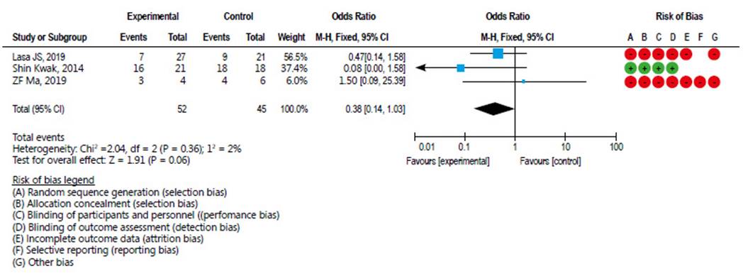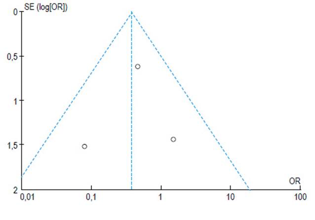 CI: Intervalo de confianza. OR: Razón de momios. a Se identificó un alto riesgo de sesgos en dos de los tres ensayos clínicos incluidos en el metaanálisis. b Se observó una notable variabilidad en los intervalos de confianza de los estudios incluidos.
