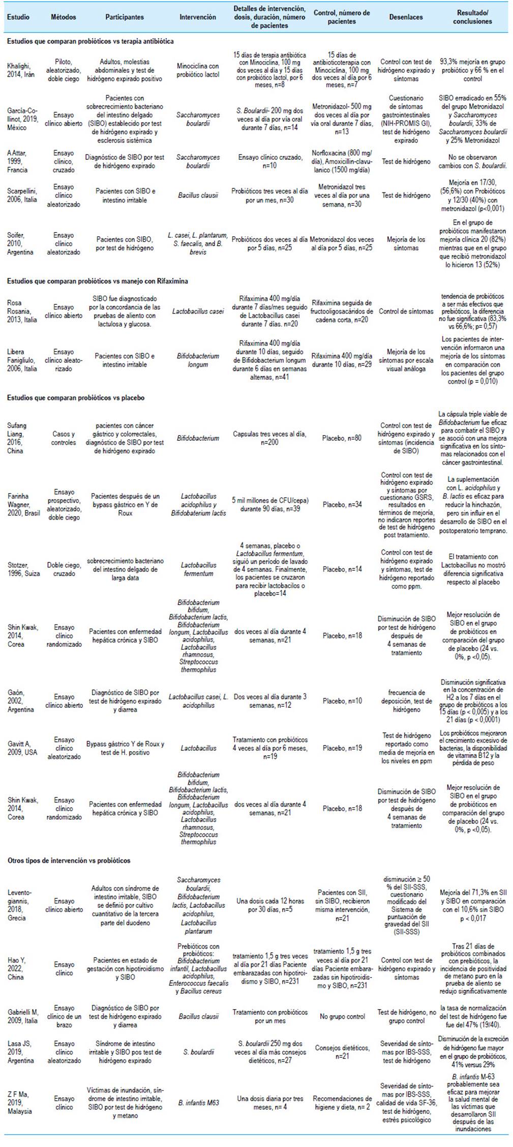 Pese a la elevada heterogeneidad de los estudios, y el elevado riesgo de sesgo, la mayoría (15/18) reportaron algún grado de beneficio clínico con el empleo de probióticos en pacientes con sobrecrecimiento bacteriano del intestino delgado.