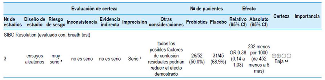 Empleando la metodología GRADE, encontramos evidencia clínica baja a favor del empleo de probióticos en comparación con placebo para la resolución de SIBO. Consulte la Tabla 2 para más detalles.