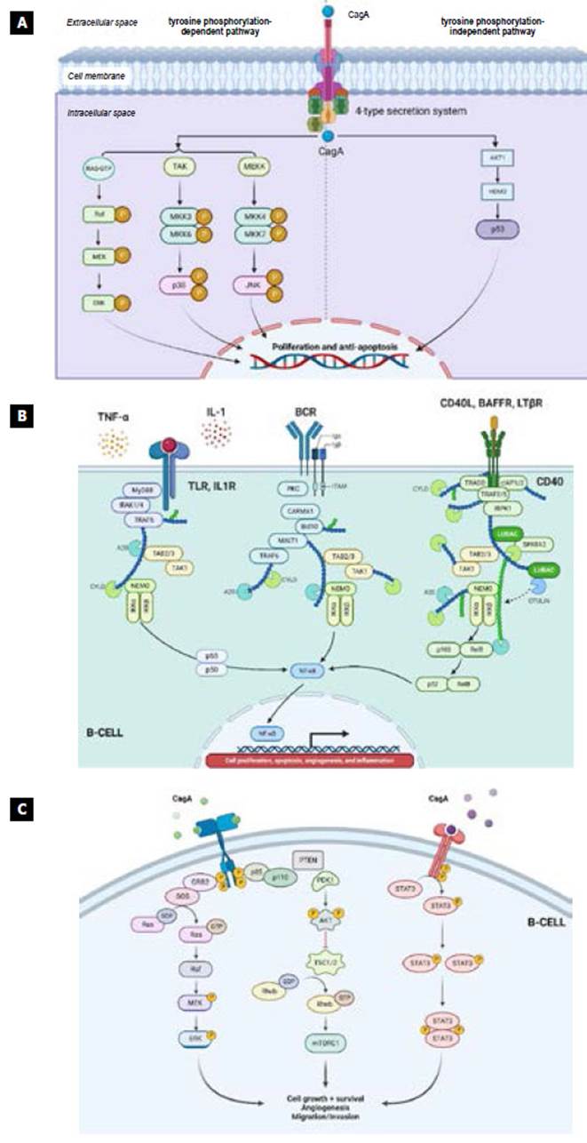 Figure 1 Signaling pathways associated with FG. A) The direct action of CagA on the tyrosine-kinase dependent and independent pathways. It is observed how, through the type-4 secretion system, the bacteria introduce CagA to the cell cytoplasm, which can activate tyrosine kinase phosphorylation-dependent pathways such as RAF, TAK, MEKK, and the phosphorylation-independent pathways such as AKT1 that regulates HDM2, responsible for modulating p53 called "the guardian of the genome," which has an impact on proliferation and anti-apoptosis. B) The canonical NF-κB pathway is activated by cytotoxin associated with gene A (CagA) through IL-8 and its receptor, which regulate it downstream, whereas the non-canonical pathway is activated more strictly by a set of molecules known as "the members of the TNF superfamily" such as B-cell activating factor (BAFF), lymphotoxin-β and CD40 ligand (CD40L), who may possibly be responsible for the more significant activity of the non-canonical NF-κB pathway due to its role in the interaction between T cells and B cells 16. C) The canonical phosphatidylinositol 3-kinase/AKT/mTOR (PI3K/ AKT/mTOR) pathway is activated by the direct action of the virulence factor (CagA) of H. pylori, as well as by the cytokines and chemokines of the persistent chronic inflammatory response. The PI3K/AKT/mTOR pathway is essential in cell proliferation and apoptosis.