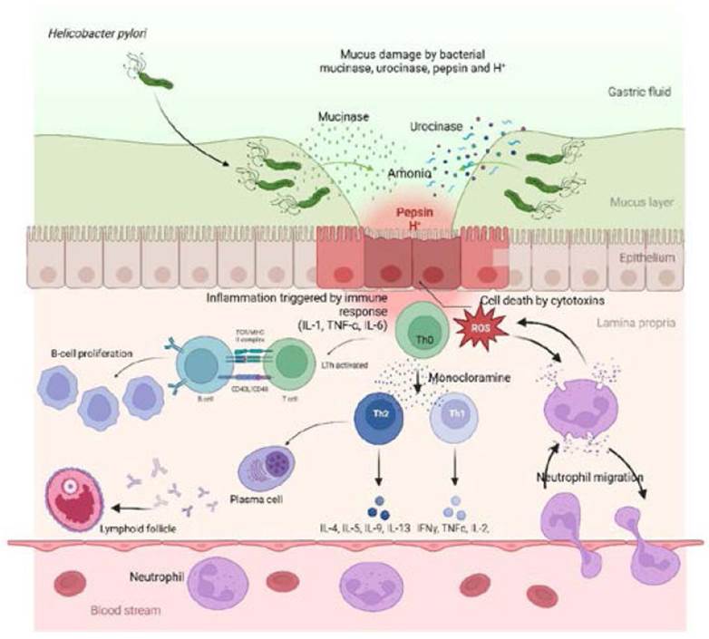 Figure 2 The mechanisms of chronic inflammatory response by which H. pylori induces FG. It is observed how the bacteria, through mucinase, urokinase, pepsin, and H+, generate a decrease in the protective layer of mucus and how urokinase forms an ammonium cloud to improve the hostile environment of the bacteria. This, in turn, produces injury and cell death of the gastric epithelium, triggering chronic inflammation and a perpetual immune response with the migration of neutrophils that release proinflammatory cytokines (IL-1, TNF-α, IL-6) that activate LT. In turn, they express CD40L and TCR on their surface to interact with MHC and CD40 receptors, causing sustained and uncontrolled proliferation of BL. On the other hand, Th0, through monochloramine, is polarized into Th1, which releases molecules (IL-2, IFN-γ, TNF-α) and Th2 (IL-4, IL-5). Polarization to a Th2-type immune response allows the activation of LB and differentiates into plasma cells that produce immunoglobulins, leading to the formation of essential lymphoid follicles in FG.
