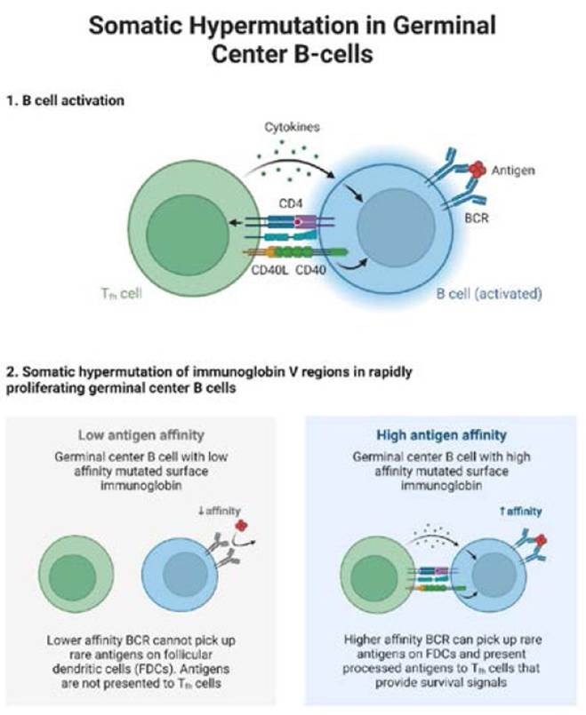 Figure 3 Somatic hypermutation and class recombination for its activation by activated cytidine deaminase (AID) in lymphoid proliferation. In the first phase, the activation of B cells through the interaction of CD40-CD40L and MHC-TCR allows the release of cytokines. The B cell, when active, recognizes the antigens of the foreign agent through the BCR. In the second phase, somatic hypermutation of the V regions of the immunoglobulin in the proliferation of the germinal centers of B cells, which the germinal centers are divided by a low and high antigen affinity of the immunoglobulin of the mutated surface for the antigen, which leads to the BCR can pick up rare antigens on follicular dendritic cells (FDC) and present processed antigens to Th cells, that provides survival signals.