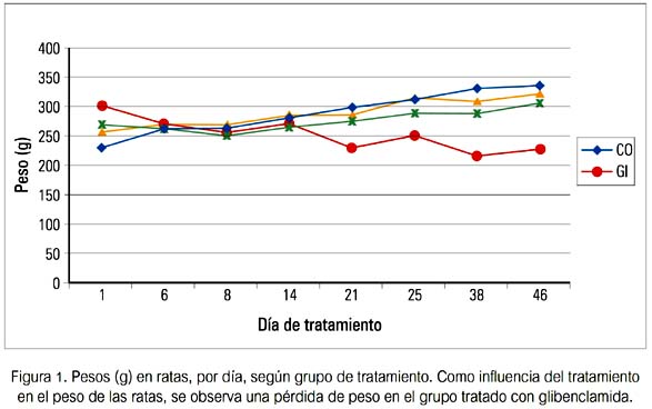 Pudo observarse que la administración del fármaco glibenclamida (10 mg/kg de peso) produjo una reducción mayor del peso que el control y de los grupos tratados con maca (figura 1).