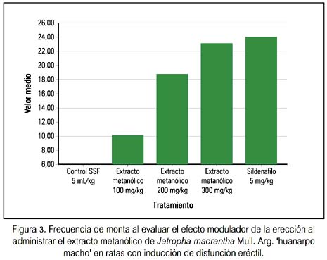 La mejora de la función eréctil se observó al incrementarse la frecuencia de monta (figura 3). Los resultados para el extracto metanólico de Jatropha macranta huanarpo macho fueron 10,1 ± 0,1, 18,8 ± 0,2 y 23,1 ± 0,1 montas, a concentraciones de 100, 200 y 300 mg/ kg del extracto, respectivamente, comparados con sildenafilo, el que expresó hasta 24,0 ± 0,5 montas. La frecuencia de intromisiones también aumentó de manera dosis dependiente (8,8 ± 0,2; 12,2 ± 0,2 y 13,0 ± 0,4), a concentraciones de 100, 200 y 300 mg/kg del extracto metanólico, respectivamente; en tanto que con sildenafilo fue hasta 13,6 ± 0,2 intromisiones (figura 4). En la figura 5 se observa que la frecuencia de eyaculaciones también siguió la secuencia anterior (33,8 ± 0,0; 30,1 ± 0,0 y 28,4 ± 0,1), a concentraciones de 100, 200 y 300 mg/kg, respectivamente; en tanto que sildenafilo lo fue hasta 29,8 ± 0,2 eyaculaciones.