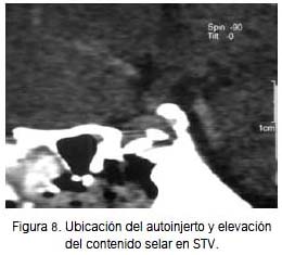 El procedimiento propuesto por el grupo mexicano de Guinto (1), si bien no evita la realización de otra incisión, permite moldear un injerto con dimensiones ajustadas casi en forma exacta al contorno de la silla turca del paciente, por lo que la denominan remodelación selar, ya que se logra una reconstrucción del contorno de la silla prácticamente a la medida del paciente. Las principales ventajas del mismo consisten en que formar el bloque fuera del campo quirúrgico es mucho más fácil que realizarlo in situ, como se efectúa en las otras técnicas que emplean materiales autólogos; el grado de elevación del contenido selar es muy preciso, lo que evita el riesgo del sobre empaquetamiento y, además, a diferencia de la grasa y músculo, su consistencia firme facilita su introducción en la fosa hipofisiaria. Por otro lado, el hecho de que esté formado por dos láminas de hueso ofrece otras ventajas: en primer lugar, se puede tener un control fluoroscópico transoperatorio del nivel de ascenso del contenido selar y, en segundo lugar, al estar ambas láminas en contacto con el hueso de la silla turca se promueve su osificación en el sitio exacto de su inserción, lo cual permite la persistencia de dicha elevación aún a largo plazo. Finalmente, al ser un procedimiento seguro, económico y técnicamente sencillo, sugerimos su aplicación en pacientes similares. Sin embargo, hay que aclarar que la elevación del contenido selar que este método ofrece no implica un sellado hermético del piso de la ST, por lo que no se recomienda su aplicación en casos de fístula de LCR asociada.