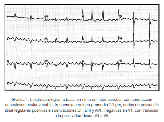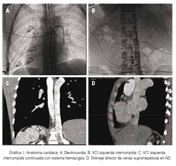 El electrocardiograma (gráfica 1) mostró ritmo de flúter auricular. El ecocardiograma documentó situs inversus, fracción de eyección del ventrículo izquierdo de 38%, sin shunt residual. La tomografía axial computarizada tuvo hallazgos compatibles con situs inversus e isomerismo izquierdo (ausencia de segmento hepático de la vena cava inferior izquierda, ambos pulmones bilobulados y poliesplenia), conexión de venas suprahepáticas y vena cava superior a la aurícula derecha (AD).