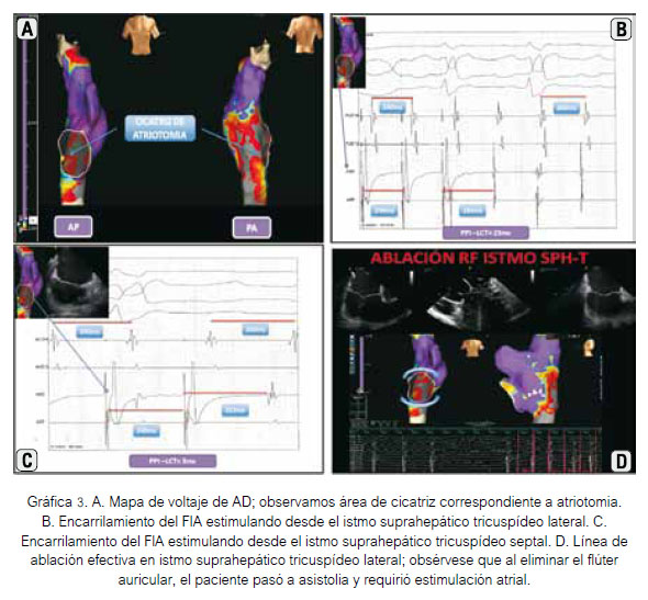 Se realizó ablación del FlA empleando sistema de mapeo tridimensional (NavX; St Jude Medical, Inc.). Se practicó venografía desde las venas ilíacas para observar la vena cava inferior izquierda, interrumpida a nivel de la vena renal derecha y continua con el sistema venoso hemiácigos, para llegar a la vena cava superior que drena en la AD (gráfica 2). Se realizó reconstrucción tridimensional de AD con un catéter circular (Inquiry AFocus II, St Jude Medical, Inc), así como mapa de voltaje con áreas de cicatriz en segmento inferior de pared lateral de AD, el cual corresponde a atriotomía. Además, se observó área de cicatriz en el tercio inferior del séptum interauricular, que corresponde al parche del cierre de CIA (gráfica 3A).