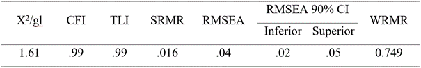 Se trabajó con el programa R versión 4.2.1(R Development Core Team, 2022). Para explorar las evidencias de validez basadas en la estructura interna del instrumento de medición, se ejecutó un análisis factorial confirmatorio AFC. Se tomó en cuenta que los índices de ajuste CFI y TLI debieron ser superiores a 0.95; el SRMR y RMSEA son menores a 0.05 (Escobedo et al., 2016; Ruiz et al., 2010; Hooper et al., 2008); una matriz de correlación policórica con el estimador de mínimos cuadrados ponderados robustos (WLSMV), pues se utilizan ítems ordinales (Brown, 2015), y porque permite detectar relaciones estructurales con precisión en presencia de leve o moderada asimetría (Li, 2014). Se evaluó si las correlaciones entre ítems superaron al .90 para evitar duplicidad en el instrumento (Tabachnick y Fidell, 2001); esto es esencial para la ejecución del análisis factorial, pues permite obtener el mayor porcentaje de explicación de la varianza (Ramos y Plata, 2015).