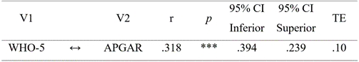 Se presenta las evidencias de validez de tipo convergente entre la escala de fun cionamiento familiar APGAR y la escala de bienestar general WHO-5, encontrán dose una correlación directa y significativa (ver tabla 3). Esto equivale a decir que cuando existe un idóneo funcionamiento familiar, entonces se tendrá una adecua da sensación de bienestar general. Por último, el tamaño del efecto es de magnitud pequeño (TE= .10).