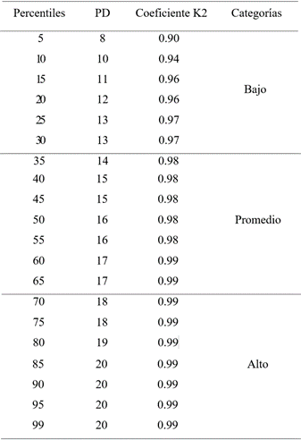 Por último, se calcularon percentiles con sus equivalentes puntos de corte asociados al coeficiente criterial de Livingston (Livingston, 1972), para todos los casos los valores K2 son mayores a .70, lo cual indica valores aceptables (Livingston, 1972).