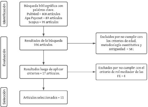 El proceso de revisión de las bases de datos antes mencionadas se llevó a cabo durante el mes de febrero del 2021. En la primera etapa de búsqueda se obtuvieron 89 resultados en Apa PsycNet, 99 es Scopus y 408 en Pubmed. Posteriormente, se removieron aquellos artículos que no estaban centrados en el estudio de las in teracciones entre NSE, FEs y rendimiento académico. Finalmente, los artículos restantes fueron analizados en su totalidad y filtrados en función de los criterios de inclusión y exclusión establecidos, siendo un total de 11 publicaciones las que se seleccionaron para ser analizadas en la presente revisión sistemática, tal y como se puede evidenciar en la Figura 1: