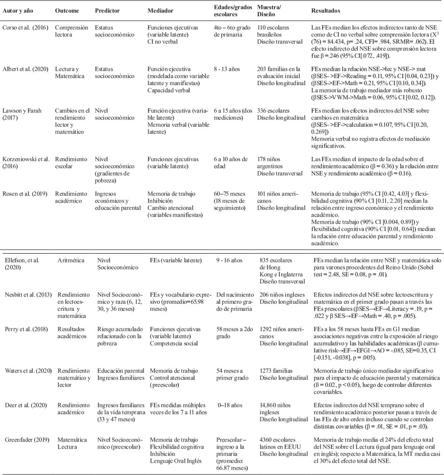 Cinco de los estudios revisados incluyeron al menos un factor cognitivo como mediador adicional a las FEs por los vínculos directos que éstas podrían tener con las funciones ejecutivas (Ellefson et al., 2020) o por ser sensibles a los efectos del NSE (Corso et al., 2016). Las variables incluidas fueron memoria verbal (Lawson y Farah, 2017), fluidez verbal (Albert et al., 2019), vocabulario expresivo (Nesbitt et al., 2013), rendimiento cognitivo general (Ellefson et al., 2020) e inteligencia no verbal (Corso et al., 2016). Las variables competidoras, en presencia de las funcio nes ejecutivas, no tuvieron significancia como mediadores del impacto del NSE sobre rendimiento académico.