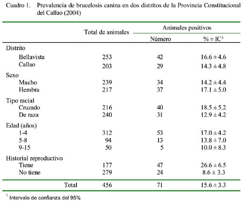 ARTÍCULO PRIMARIO Prevalencia de brucelosis canina en dos distritos de la Provincia Constitucional del Callao Hernán Ramírez L.1; Sonia Calle E.2,3; Luisa Echevarría C.4 y Siever Morales C.2 1 Práctica privada RESUMEN El objetivo del presente estudio fue determinar la prevalencia de brucelosis canina (Brucella canis) en dos distritos de la Provincia Constitucional del Callao. Se recolectaron 456 sueros de perros sin distinción de sexo, raza y edad, que se analizaron mediante la prueba de Inmunodifusión en Gel de Agar (IDGA) con antígeno de B. ovis. Se encontró una prevalencia de 15.6 ± 33% (71/456). No se encontró diferencia estadística significativa entre las variables distrito, sexo, raza o grupo etáreo, pero se encontró diferencia estadística significativa (p<0.05) entre animales con y sin historia reproductiva (26.5 y 8.6%, respectivamente). ABSTRACT The objective of this study was to determine the prevalence of canine brucellosis (Brucella canis) in two districts of the province of Callao. A total of 456 sera were collected from dogs without distinction of breed, sex and age. Samples were analyzed by the Agar Gel Immunodiffusion (AGID) test using B. ovis antigen. The results indicated that 15.6 ± 3.3 (71/456) of sampled animals were positive. No statistical differences were found due to district, breed, sex or age; however, differences were found (p<0.05) beetween dogs with and without reproductive history (26.5 and 8.6% respectively). INTRODUCCIÓN La brucelosis canina es una enfermedad zoonótica de distribución mundial, de curso crónico, causada por Brucella canis. La presencia de esta bacteria fue detectada por primera vez en 1966, durante investigaciones de abortos y problemas reproductivos en un criadero de perros Beagle en los Estados Unidos de Norteamérica (Carmichael y Shin, 1999). La enfermedad ha sido reconocida principalmente en el perro y ocasionalmente en el hombre, pero sólo el perro puede transmitir la infección. El hombre parece tener un grado considerable de resistencia natural a la infección por B. canis, y los casos reportados son generalmente debidos a exposiciones de laboratorio o por contacto directo con perros infectados (Stoenner y Kaplan, 1979). La transmisión es, generalmente, a través del contacto con tejidos placentarios contaminados, fetos abortados, secreciones vaginales o semen de animales infectados. Se puede observar signos clínicos como abortos, mortalidad perinatal (Carmichael y Shin, 1999), dermatitis escrotal, prostatitis, epididimitis (Kirk, 1997), agrandamiento ganglionar generalizado, uveitis anterior (Jubb et al., 1991), discoespondilosis y reducción de los espacios intervertebrales (Boeri et al., 2001). Trabajos previos en Lima mencionan un 28 % de perros positivos (Reyes, 1977); sin embargo, no existen estudios recientes sobre el desarrollo de la enfermedad en la población canina. Es por este motivo que el presente estudio fue diseñado para determinar la prevalencia de brucelosis canina en una zona geográfica determinada. MATERIALES Y MÉTODOS Animales e información requerida El estudio se llevó a cabo en el 2004 en los distritos de Bellavista y Callao de la Provincia Constitucional del Callao. Se muestrearon perros de ambos sexos y de diversas edades, procedentes de una clínica veterinaria del Callao (Clínica 1), de una clínica veterinaria de Bellavista (Clínica 2), de una campaña de empadronamiento canino (Campaña 1) y de una campaña de salud canina (Campaña 2). Los datos recolectados incluyeron edad, sexo, raza, historial reproductivo y costumbres, como salir a parques o jardines. En el caso de perros con historial reproductivo se indagó sobre el número de cruzamientos, partos, problemas reproductivos, abortos y muertes perinatales. En la determinación del tamaño muestral se utilizó una prevalencia referencial de 50% por no haber estudios similares previos sobre esta enfermedad (Ahlbom y Norell, 1990). El número requerido fue de 385 animales pero se muestrearon 456 perros. Análisis de laboratorio Se obtuvieron muestras de sangre por punción de la vena cefálica. El suero resultante se almacenó en temperatura de congelación hasta su posterior procesamiento en el Laboratorio de Microbiología y Parasitología de la Facultad de Medicina Veterinaria, Universidad Nacional Mayor de San Marcos. Se utilizó la prueba de Inmunodifusión en Gel de Agar (IDGA), que consiste en una reacción de precipitación en fase líquida entre el antígeno y el anticuerpo, formando bandas visibles de precipitación (Tizard, 1998). Esta técnica tiene la ventaja de emplear un antígeno de B. ovis que contiene un lipopolisacárido rugoso, específico para brucelas rugosas (como B. canis) y que no presenta reacciones cruzadas con otras especies de brucela en su forma lisa (Véliz et al., 1974). La IDGA es una prueba cualitativa, por lo que se consideran positivos los sueros que reaccionan con el antígeno formando la banda de precipitación dentro de 24 a 48 horas y negativos los sueros que no forman bandas de precipitación. Análisis de datos Se determinó la prevalencia de la brucelosis canina con intervalos de confianza del 95%. Se usó la prueba de chi-cuadrado para evaluar la asociación de la tasa de infección con las variables distrito, sexo, raza, grupo etáreo e historial reproductivo. RESULTADOS En el Cuadro 1 se aprecia la prevalencia de brucelosis canina obtenida, según el distrito de procedencia, sexo, tipo racial, edad e historial reproductivo. La prevalencia global fue de 15.6 ± 3.3% (71 positivos de 456 perros muestreados). No hubo diferencias significativas (p>0.05) entre las variables bajo estudio con la tasa de infección, con excepción entre animales con historial reproductivo (26.5, 47/177) y sin dicho historial (8.6%, 24/279, p<0.05). DISCUSIÓN La prevalencia de brucelosis canina fue similar en los distritos de Bellavista y Callao, posiblemente debido a que son distritos limítrofes, don